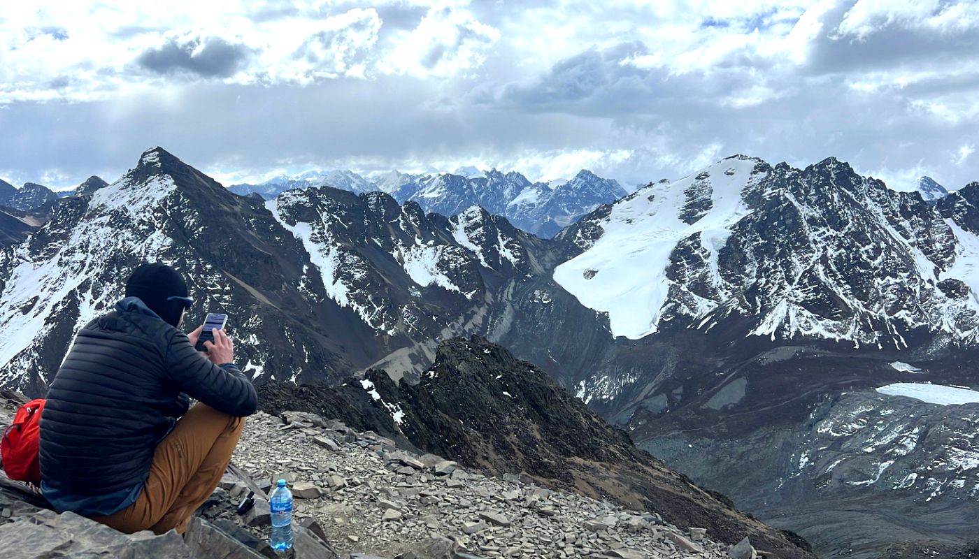 Vistas panorámicas 360. desde la cumbre del Pico Austria de todo el macizo del Condoriri, con múltiples nevados y lagunas.