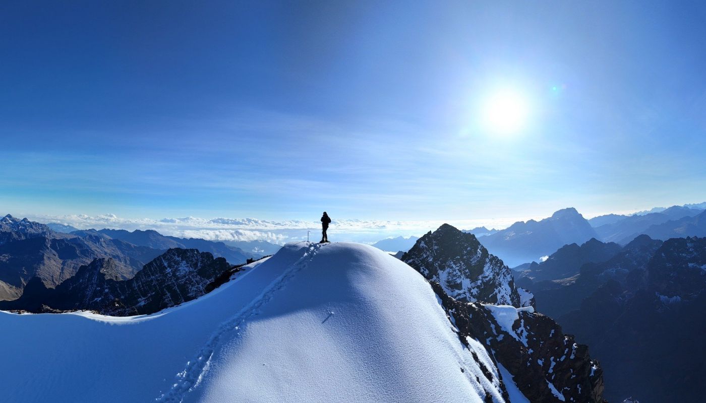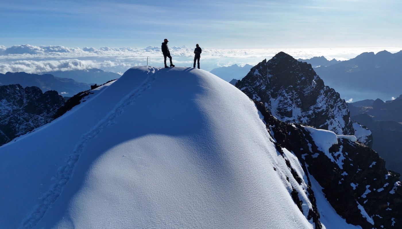 Del Campo Base caminamos por el valle (1.5 horas) hasta el glaciar de La Pequeña Ilusión. Escalamos la parte central del glaciar y pasamos por el Pico Tarija (5,300 m) en 2 horas. Bajamos una parte rocosa para llegar a la cresta de P.A. Una escalada tecnica de 80 m a casi 55° nos lleva a la cumbre (5,450 m) en 2 horas más. Volvemos hasta el Campo Base por la misma ruta. Recogemos todo el equipo y volvemos directamente a la Rinconada donde la movilidad nos espera para traernos de vuelta a La Paz.